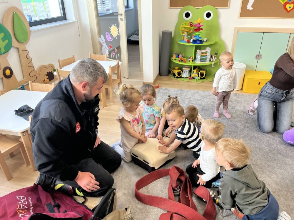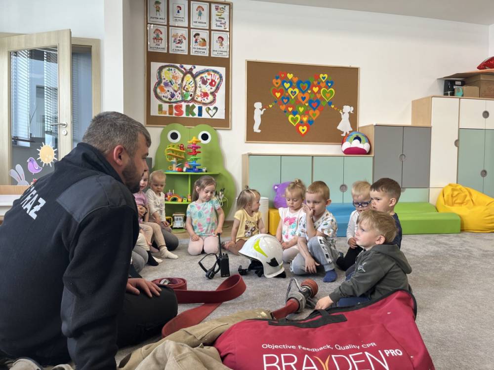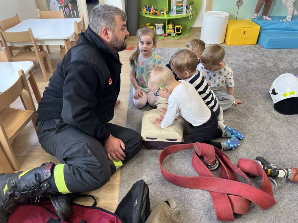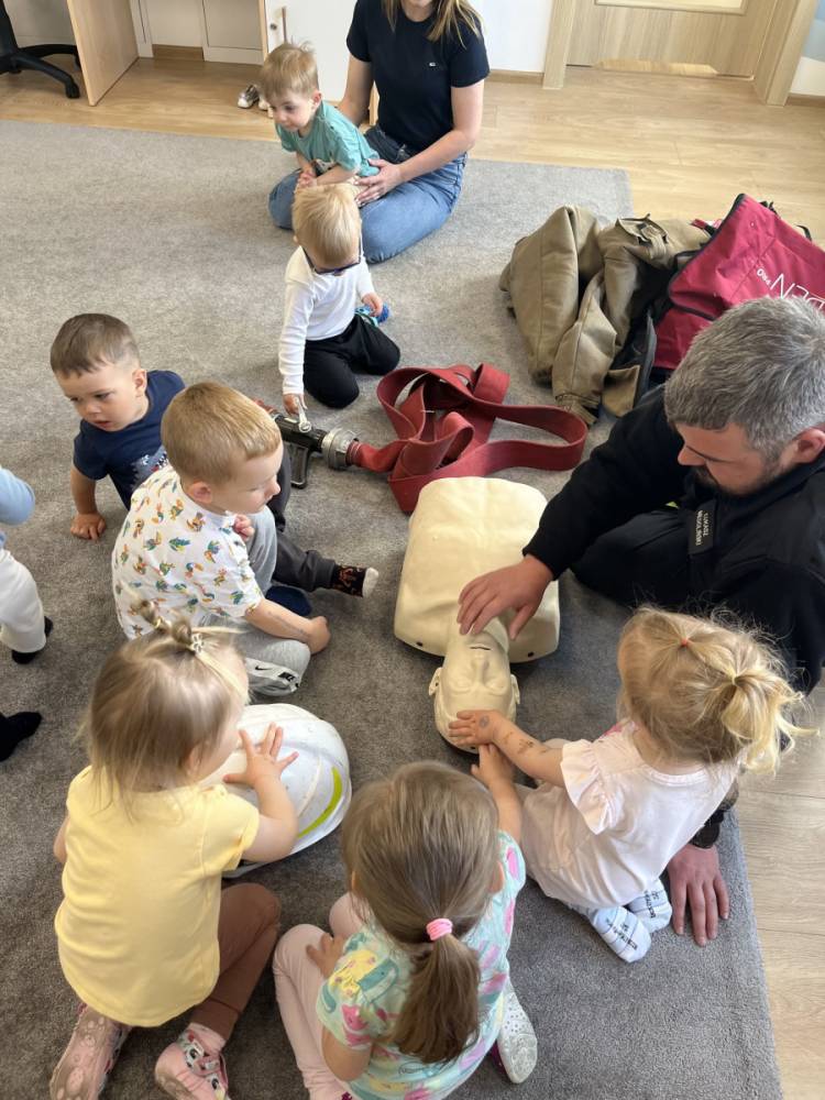 Dzieci poznały specyfikę pracy strażaka. Zobaczyły wyposażenie niezbędne w jego pracy, mogły zobaczyć jak pomóc osobie potrzebującej.
