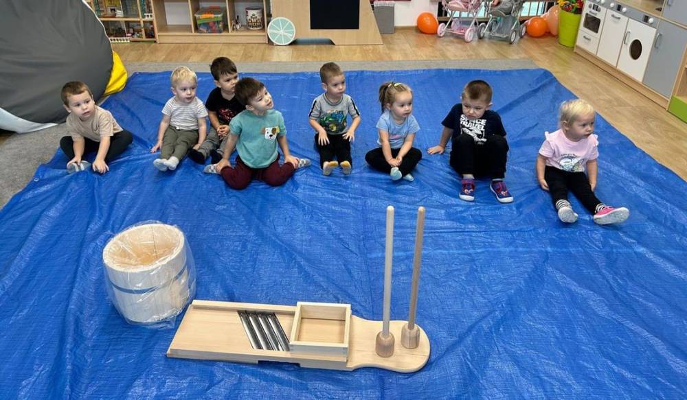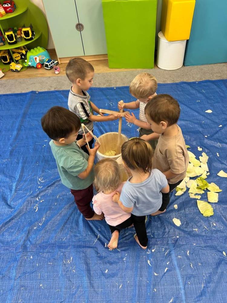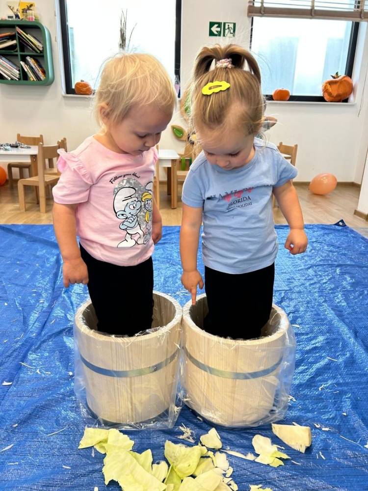 Nawiązując do tradycji, zorganizowaliśmy także kiszenie kapusty. Maluchy mogły samodzielnie szatkować kapustę oraz – zgodnie ze zwyczajem – ubijać ją nogami, co było dla nich nie tylko zabawne, ale też bardzo angażujące.