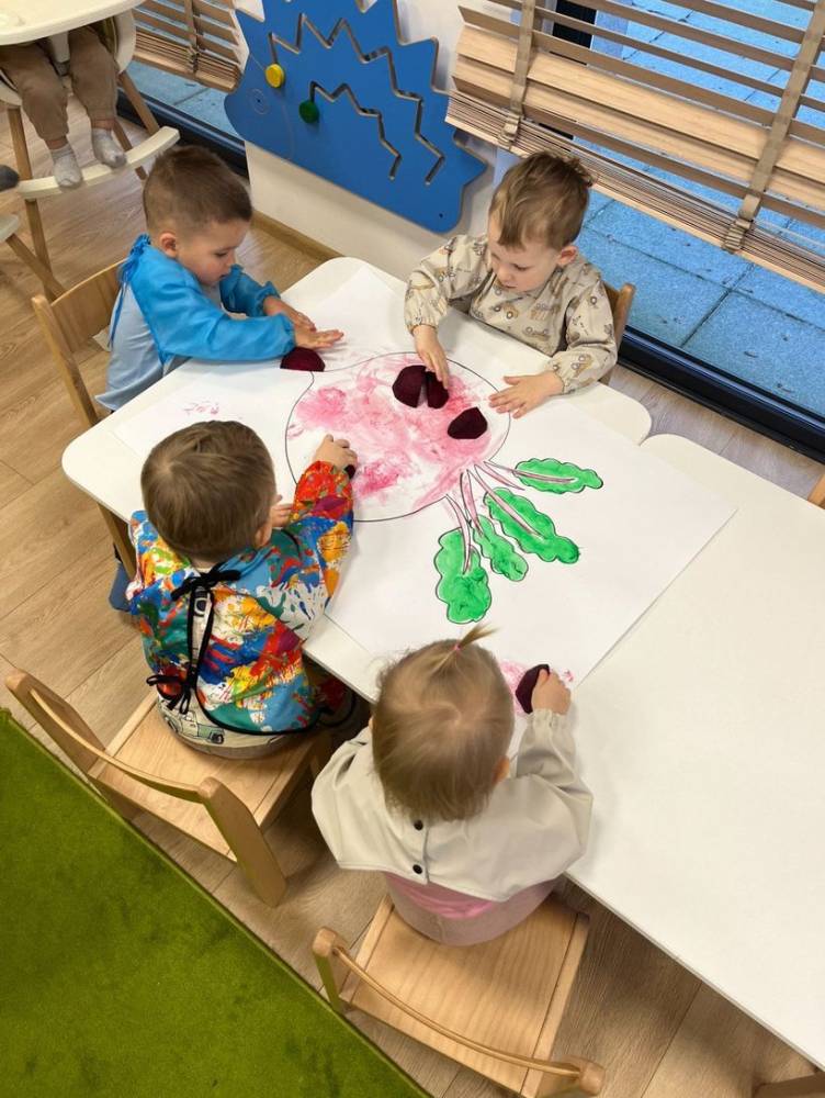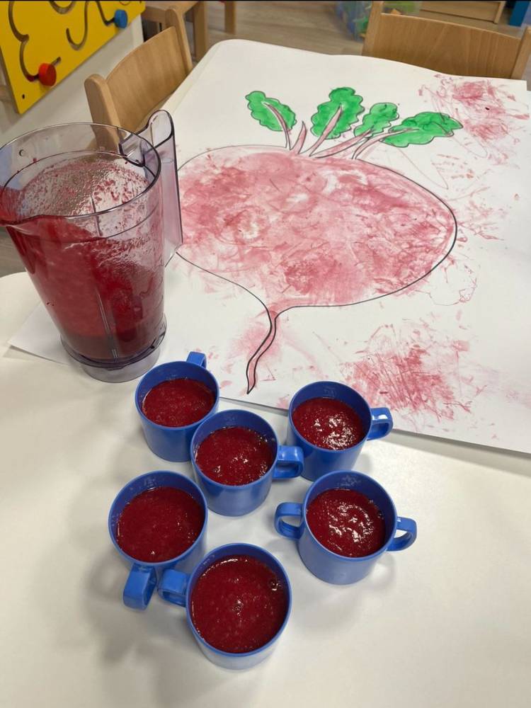 Podczas Dnia Buraka maluchy próbowały pysznego, zdrowego koktajlu z buraków, a potem tworzyły niezwykłe prace plastyczne, malując… prawdziwymi burakami!