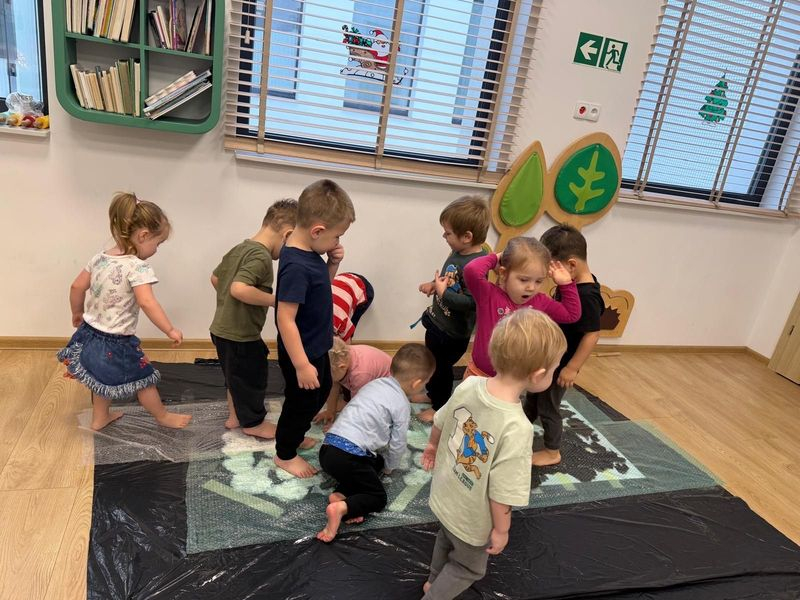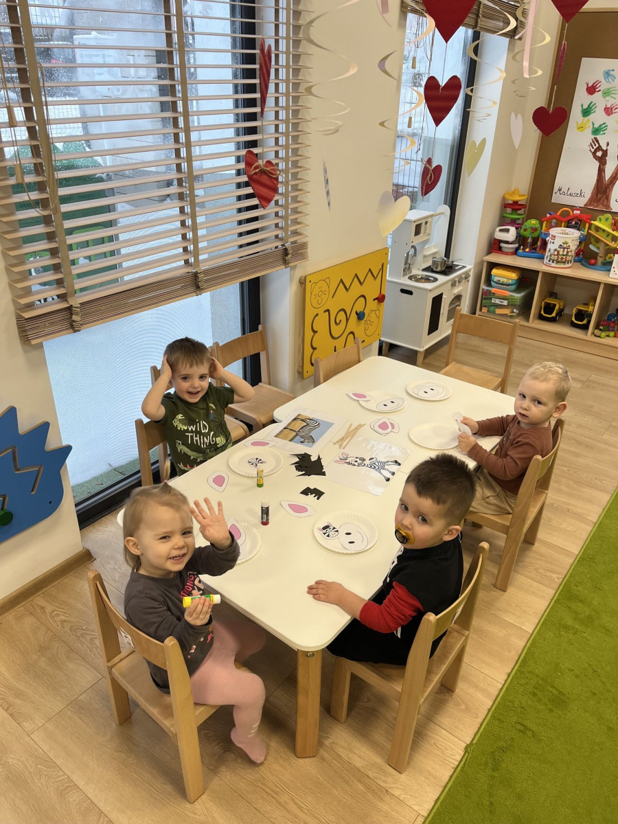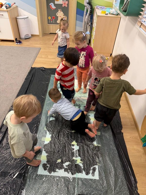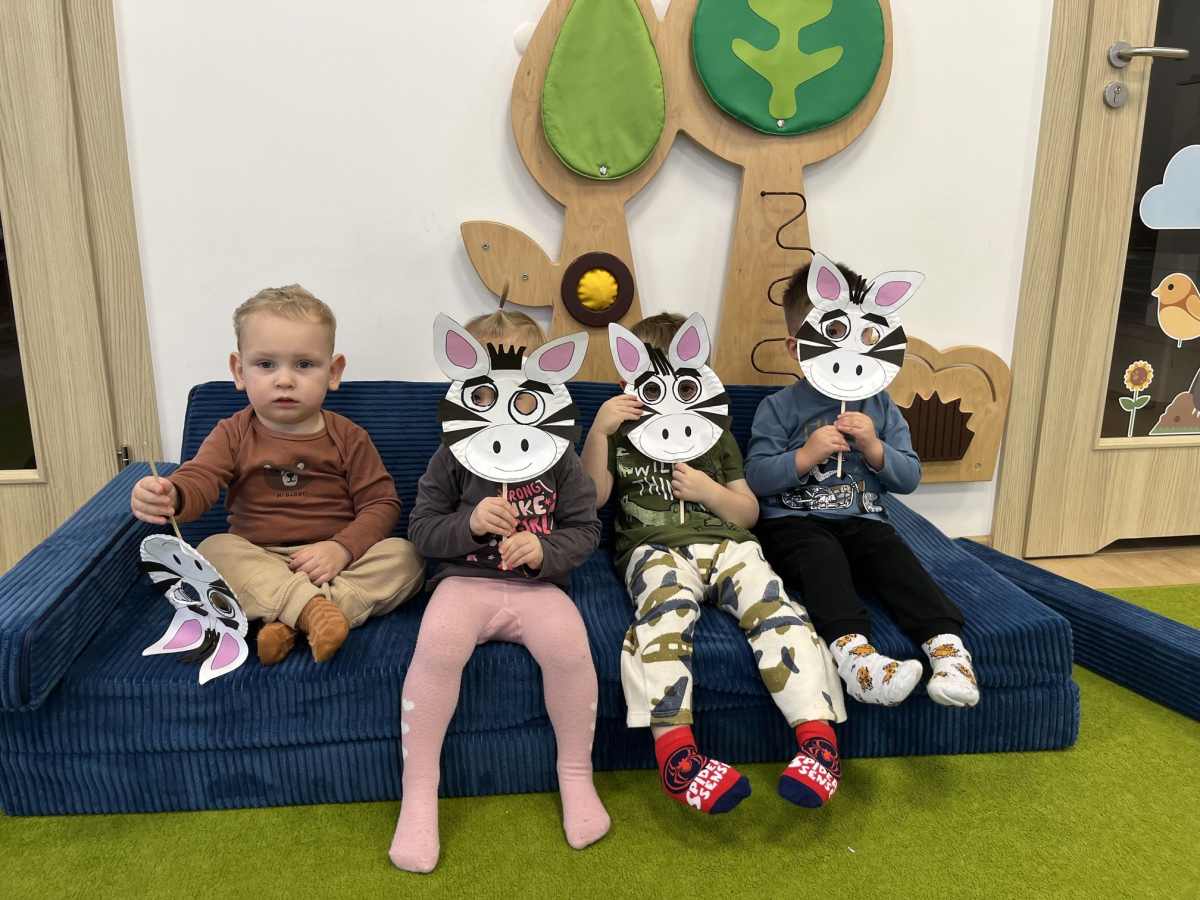 Dodatkowo świętowaliśmy Dzień Zebry. Maluszki tworzyły kolorowe maseczki zebry, rozwijając swoją kreatywność, natomiast starszaki zamieniły się w małych artystów – za pomocą rączek i nóżek odbijały farbę na foli bąbelkowej. Zabawa była fantastyczna.